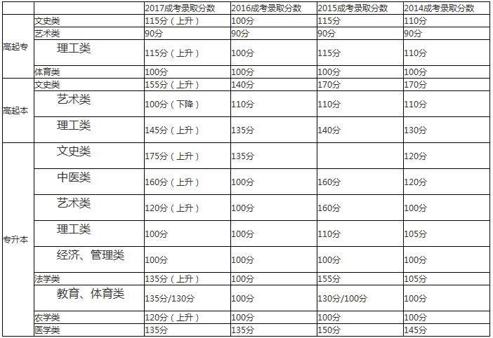 2014年——2017年山東成人高考招生網(wǎng)上錄取最低控制分?jǐn)?shù)線